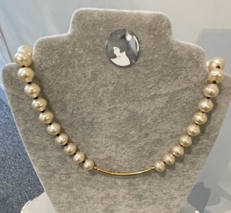 COLLIER 65cm PERLES BAROQUES " ESCARGOTS " crème 12mm et mini perles noires intercalaires. Fermoir TUBE doré.