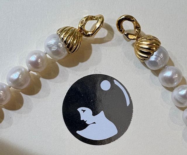 COLLIER SAUTOIR 120cm PERLES EAU DOUCE 08mm légèrement BAROQUES avec quelquefois de petites stries naturelles . Enfilage à l'ancienne sur fils de soie avec des noeuds entre chaque perle. . Magnifique fermoir TOI et MOI en  ARGENT 925°%. DORE 18K