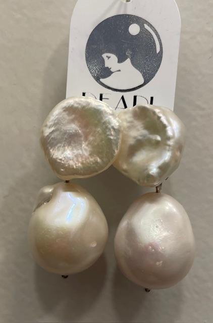 PUCES d'oreilles tiges droites en ARGENT RHODIE 925°% BOUTONS PASTILLES légèrement BAROQUES 16mm + PENDANTS POIRES BAROQUES PERLES NATURELLES d'EAU DOUCE 16-18mm environ.
